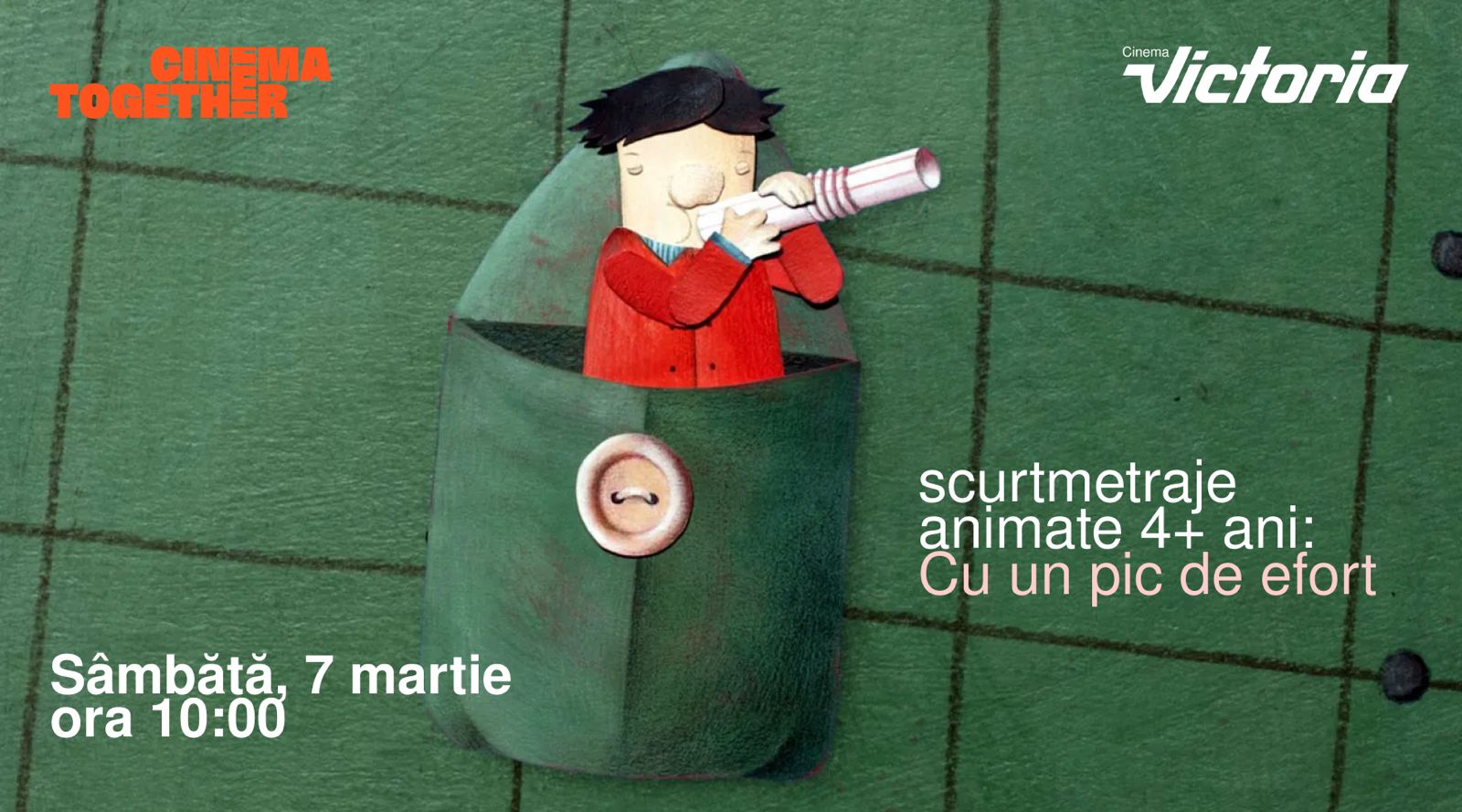 Prin 𝗩𝗜𝗖𝗧𝗢𝗥𝗜𝗔 𝟰+ 𝗖𝗶𝗻𝗲𝗺𝗮 𝗰𝘂 𝗷𝗼𝗮𝗰𝗮̆ 𝘀̦𝗶 𝗮𝘃𝗲𝗻𝘁𝘂𝗿𝗮̆, noul program dedicat copiilor între 4 şi 7 ani, ne propunem sǎ organizǎm în mod regulat proiecții cu scurtmetraje internaționale potrivite pentru copii mici (4 ani+) și părinții lor.